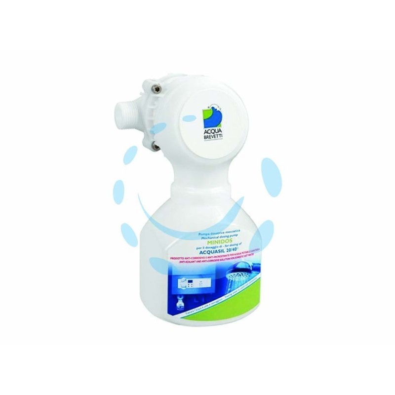 pompetta dosatrice per il dosaggio di acquasil 20/40 - corpo e piastra di attacco in materiale plastico - attacco dima in materiale plastico con ghiere e dadi in ottone - attacco F 1/2" - portata 0,8mc/h - pressione min 1,5 max 10 bar - MINIDOS con il dosaggio di prodotti a base di polifosfati, anche a bassissime concentrazione, è in grado di contrastare formazione di incrostazioni calcaree e corrosioni nelle linee di distribuzione dell'acqua calda