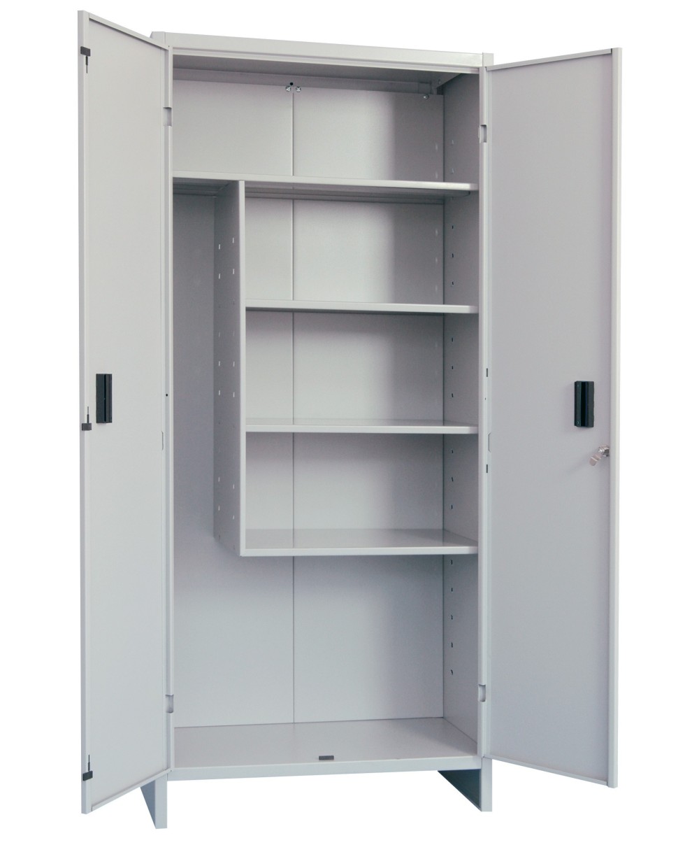 in lamiera dim acciaio verniciata. Versione portascope con 1 ripiano grande, 3 ripiani piccoli, 1 serratura a cilindro, 2 mainigliette e arresto battente. Doppia anta. Dimensioni 60x40xh179,5 cm. Colore grigio. In kit da montare.