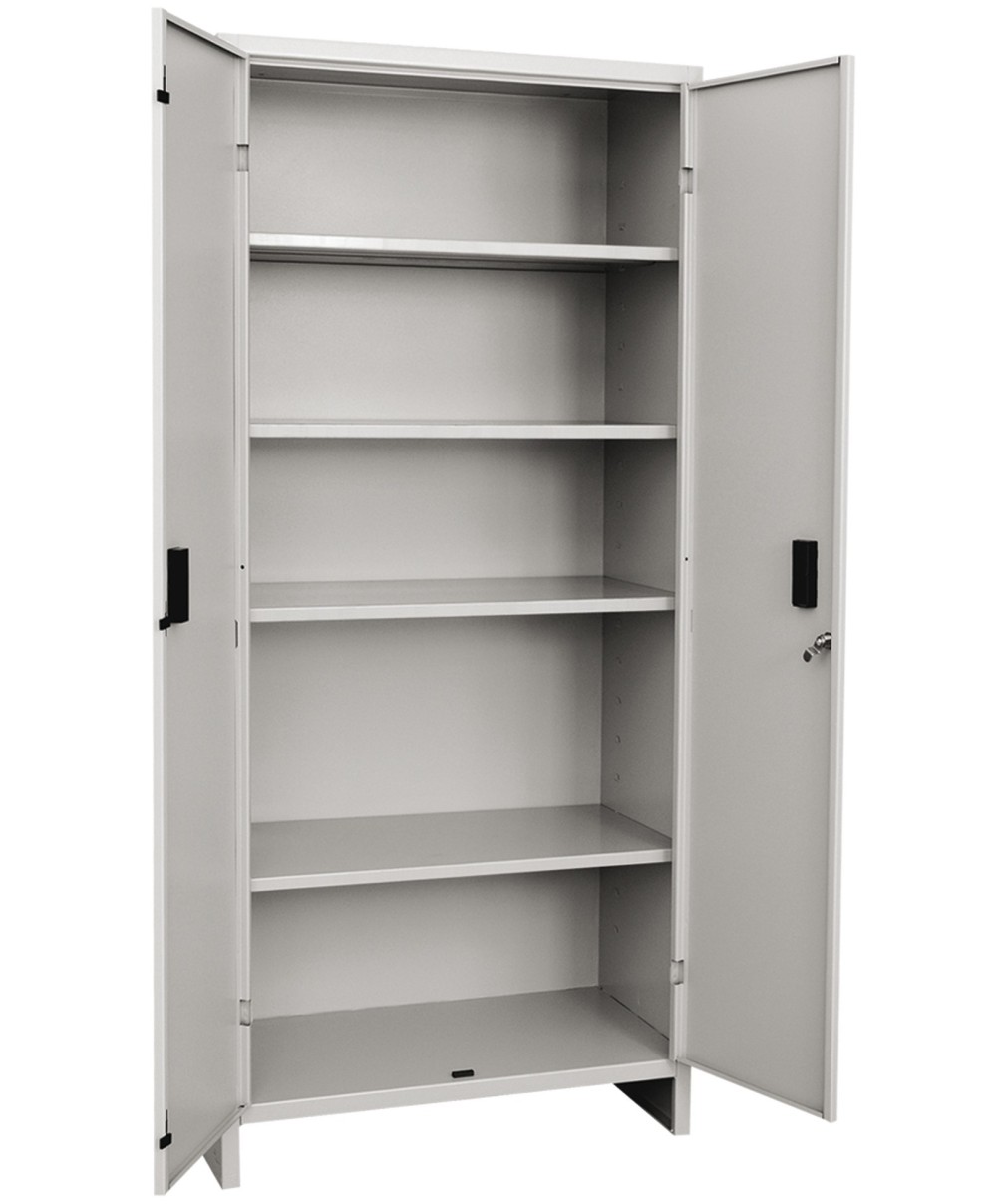 in lamiera di accaiaio verniciata. Versione tutto piani con 4 ripiani, 1 serratura a cilindro, 2 mainigliette e arresto battente. Doppia anta. Dimensioni 80x40xh179,5 cm. Colore grigio. In kit da montare.