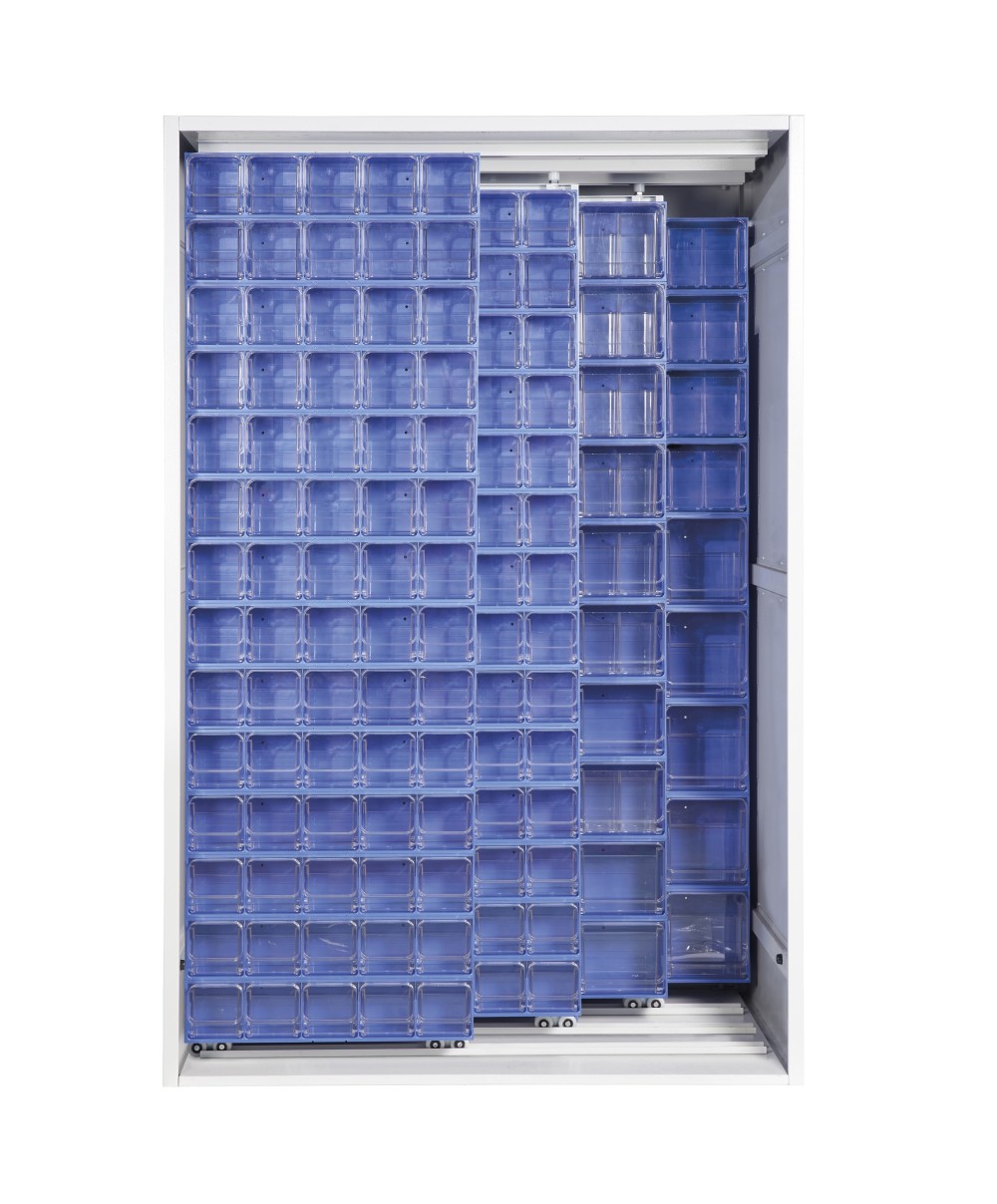 In metallo. A 3 pannelli scorrevoli con 224 cassetti blu. Dimensioni cm 127x80x195h