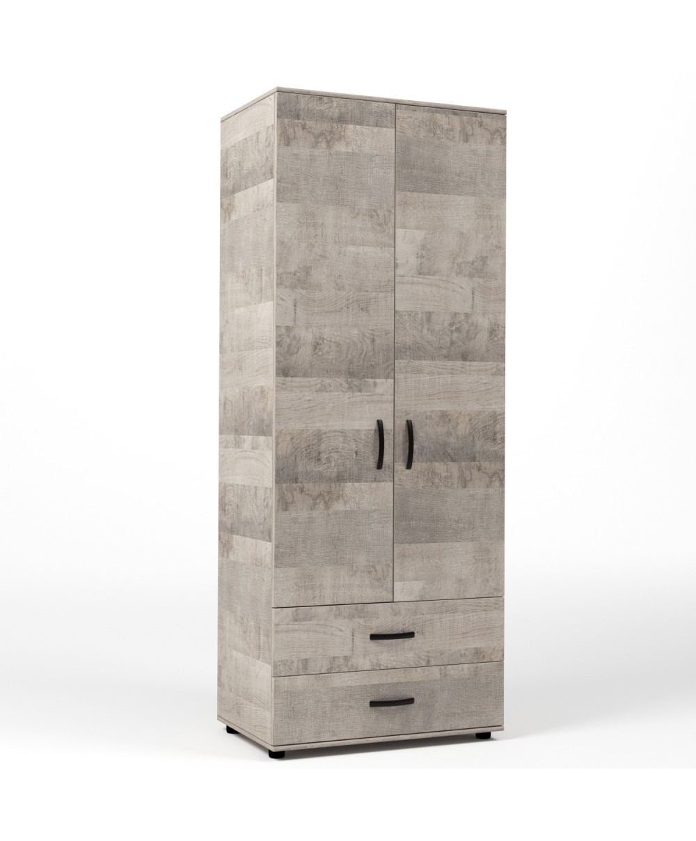 armadio due ante e due cassetti. Una asta appendiabiti interna. Maniglie in metallo, piedini regolabili. Dimensioni 80 x 52 x h 205 cm Colore rovere plat.