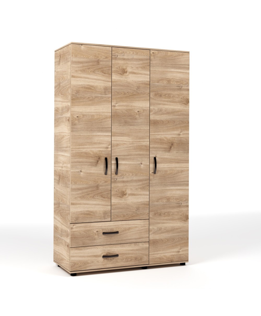 armadio tre ante e due cassetti. Interna un'asta appendiabiti e 4 ripiani. Maniglie in metallo e piedini regolabili. Dimensioni 120 x 52 x h 205 cm. Colore rovere miele