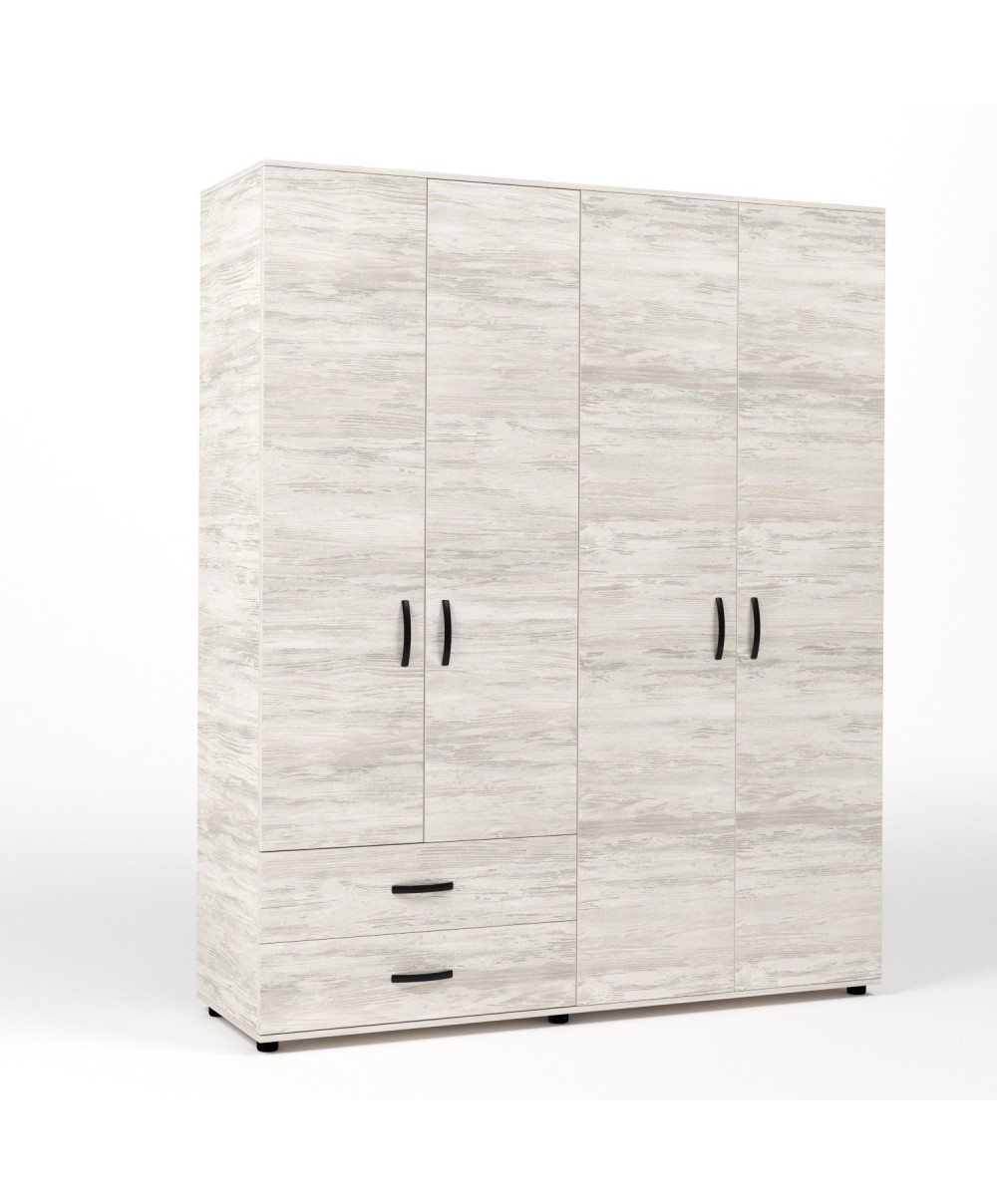 armadio 4 ante e due cassetti. Interna un'asta appendiabiti e 4 ripiani. Mmaniglie in metallo e piedini regolabili. Dimensioni 160 x 52 x h 205 cm. Colore bianco ven.