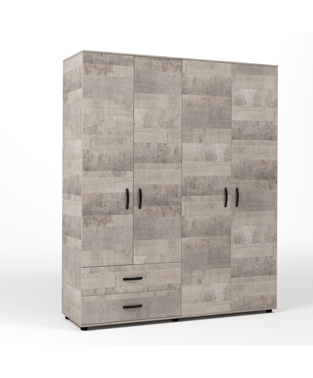 armadio 4 ante e due cassetti. Interna un'asta appendiabiti e 4 ripiani. Mmaniglie in metallo e piedini regolabili. Dimensioni 160 x 52 x h 205 cm Colore rovere plat.