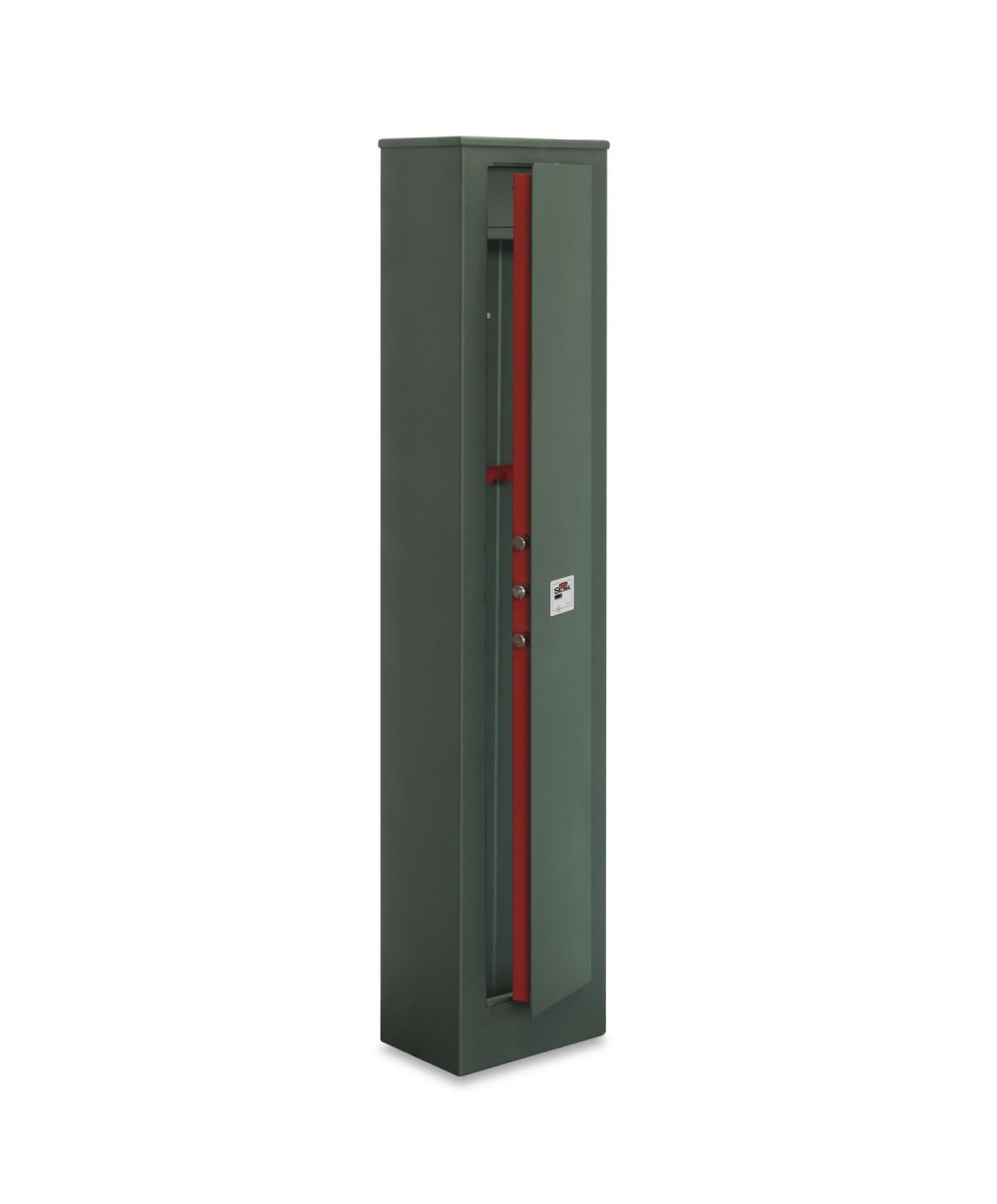 Struttura in acciaio speciale. Sostegni canna per fucile. Fori di ancoraggio a muro e a pavimento (4+2). Fornito con rastrelliera a 5 posti. Tesoretto interno a chiave.< Catenacci 3+2. Serratura a chiave a doppia mappa a 2 mandate e 6 leve asimmetriche a molle indipendenti. Dimensioni esterne 308 x 208 x h 1.480 mm. Dimensioni interne 295 x 135 x h 1.305 mm. Colore verde metallizzato. Peso 44,5 kg.