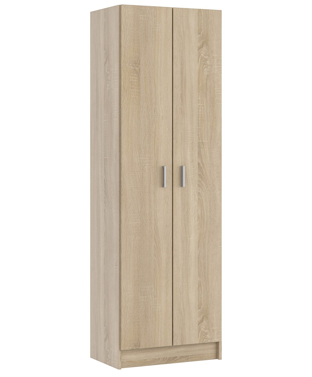 LINEA MULTIUSOS armadio a 2 ante e 5 ripiani regolabili in altezza. Pannello in truciolare melaminico spessore 15 mm. Maniglie in ABS in colore grigio alluminio. Cerniere metalliche. Sopporti metallici per sostenere i ripiani. Peso massimo ripiano: 8 kg. Tacchetti ABS antirumore e antigraffio per la parte inferiore del mobile. Facile da montare e da pulire. Dimensioni 59 x 37 x h 180 cm. Colore rovere canadian.