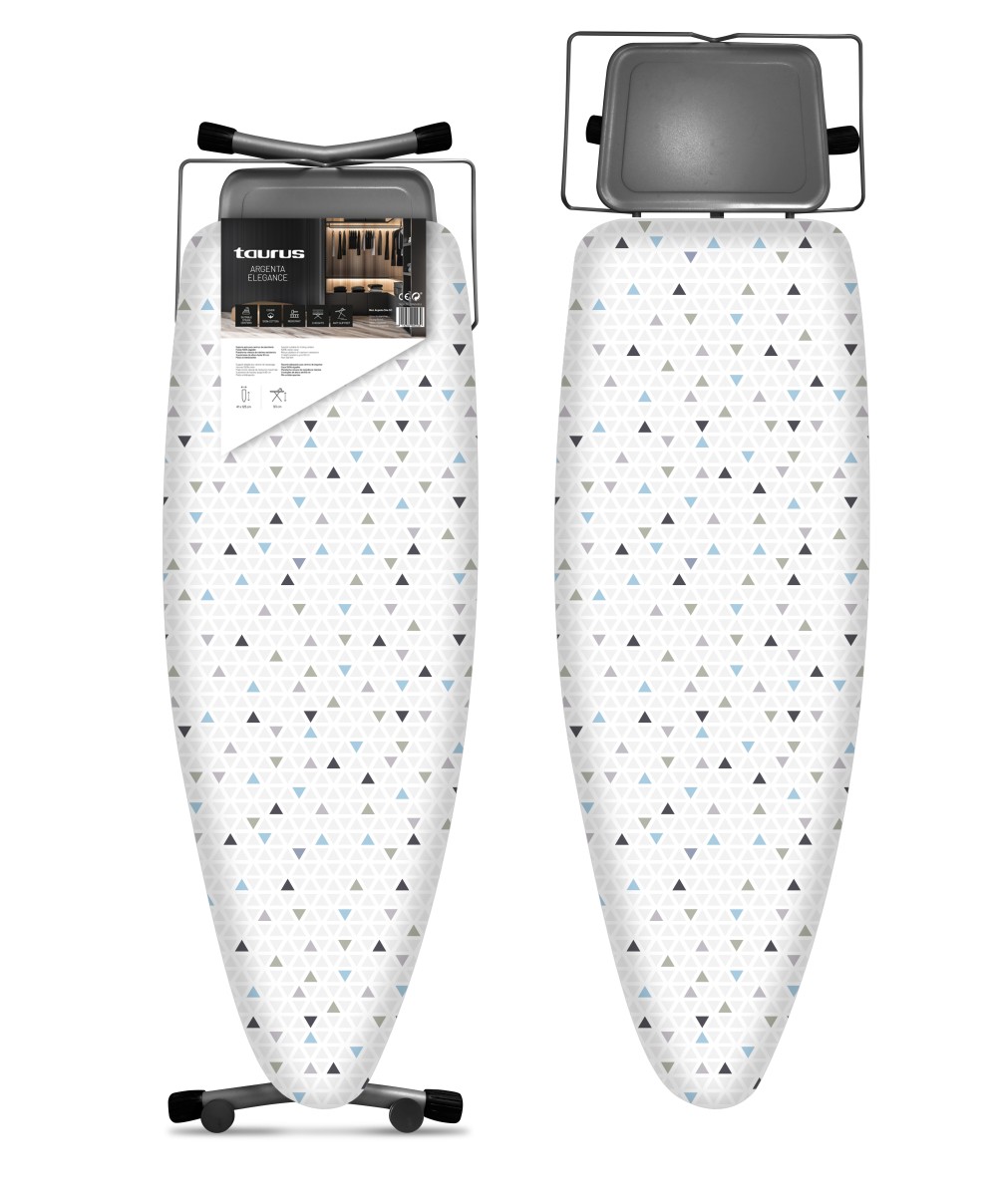 Mod. Taurus Argenta Elegance Design ergonomico. Ampia base in ferro (acciaio 0.8 mm) per stazioni di vapore. Copertura in cotone 100% con imbottitura in schiuma da 8 mm, massima resistenza piattaforma robusta. Il poggiaferro può essere ripiegato. E ha due ruote per un facile trasporto. Regolatore automatico di altezza 60/98 cm, permette di stirare seduti. 2 gambe ad alta resistenza.