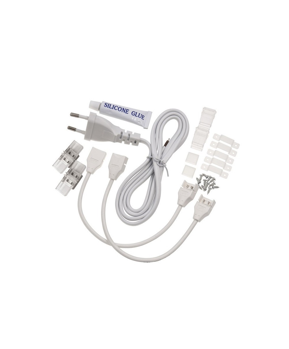 Kit aggiuntivo per Strip LED COB 230V da 10W. Contiene 2 testate terminali stagne, 1 cavo di alimentazione, 4 connettori, 1 tubo di sigillante, accessori per il fissaggio.