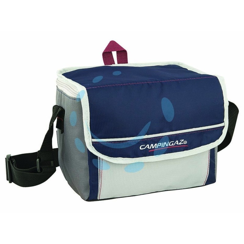 capacità lt.5 - contiene 6 lattine da cl.33 o 4 bottiglie da lt.0,5 - peso gr.310 - ripiegabile con tracolla regolabile e tasca frontale - tessuto bicolore blu/grigio - isolamento con schiuma isolante in PE con celle chiuse da mm.6 - prestazioni: 8 ore con "FREEZ' PACK" (venduto separatamente)