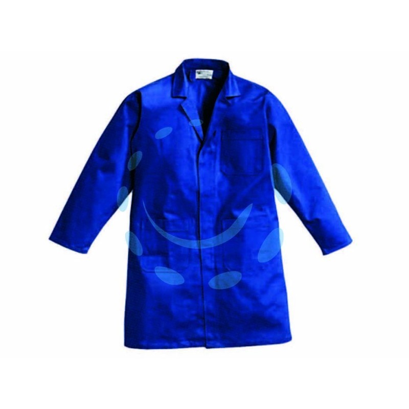 tessuto 100% in cotone sanforizzato colore blu, peso gr.280 mq. - restringimento +/- 5% - collo con bavero in doppio tessuto, maniche a giro, chiusura con bottoni con asola, 1 taaschino applicao sul petto e 2 tasche applcate in vita