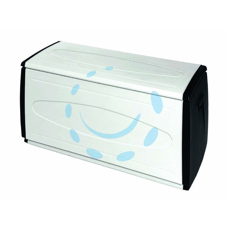 in materiale termoplastico, colore sabbia/azzurro, utilizzabile sia in ambienti interni che in ambienti esterni, ventilato e resistente alla pioggia, facile da trasportare grazie alle pratiche impugnature laterali