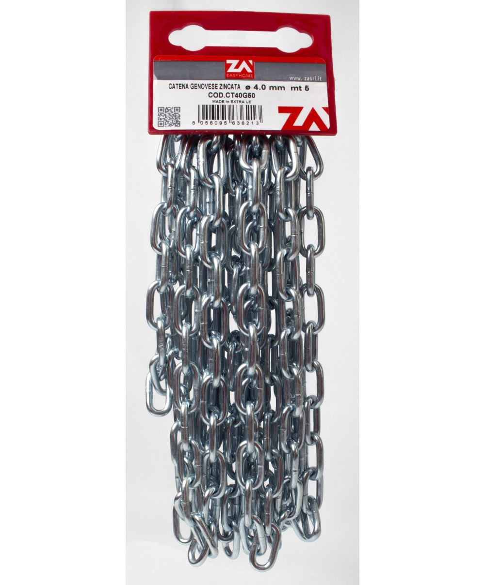 Tipo maglia genovese in acciaio saldata e zincata DIN 5685/A. Spessore 4 mm. Dimensioni maglia 28 x 15 mm. Confezione da 5 m.