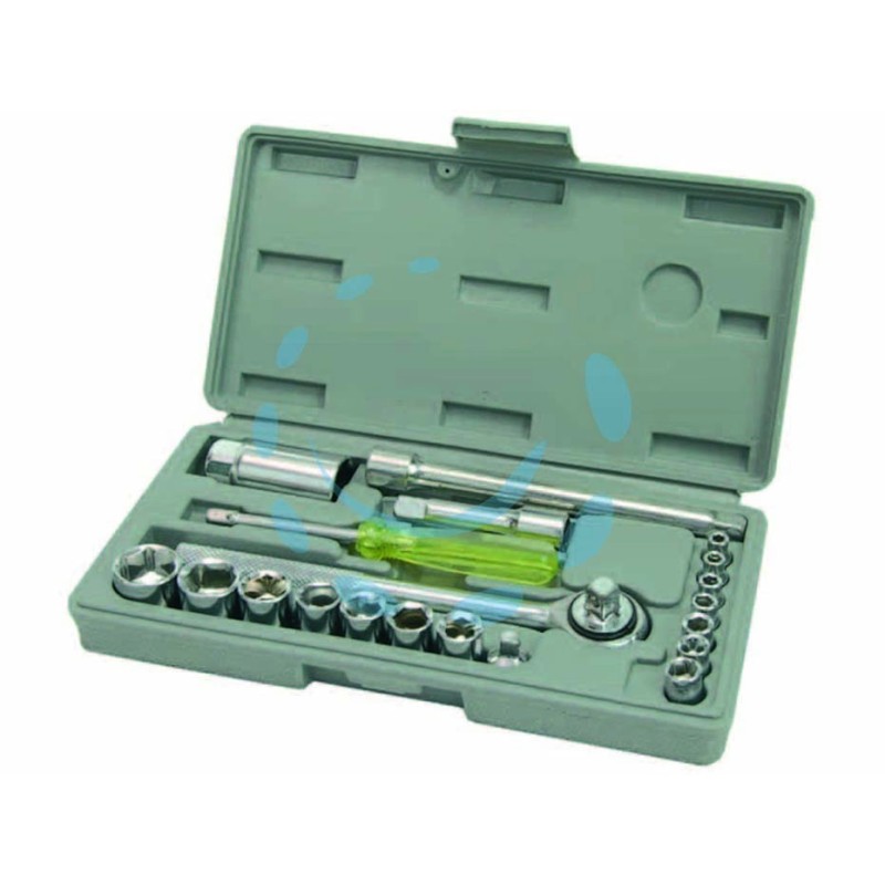 componenti in acciaio cromato, contenuto: 11 chiavi a bussola esagonali quadro 1/4" misure mm.4-4,5-5-5,5-6-7-8-9-10-11-12 + 3 bussole 3/8" misure 13-14-17mm. + 1 cricchetto attacco quadro 3/8" revesribile + 1 riduttore + 1 bussola per candela da mm.21 + 1 giravite con quadro da 1/4" + 2 prolunghe da 3/8" misure da mm.70÷150 + 1 cassetta in plastica misure mm.345x130x40h.