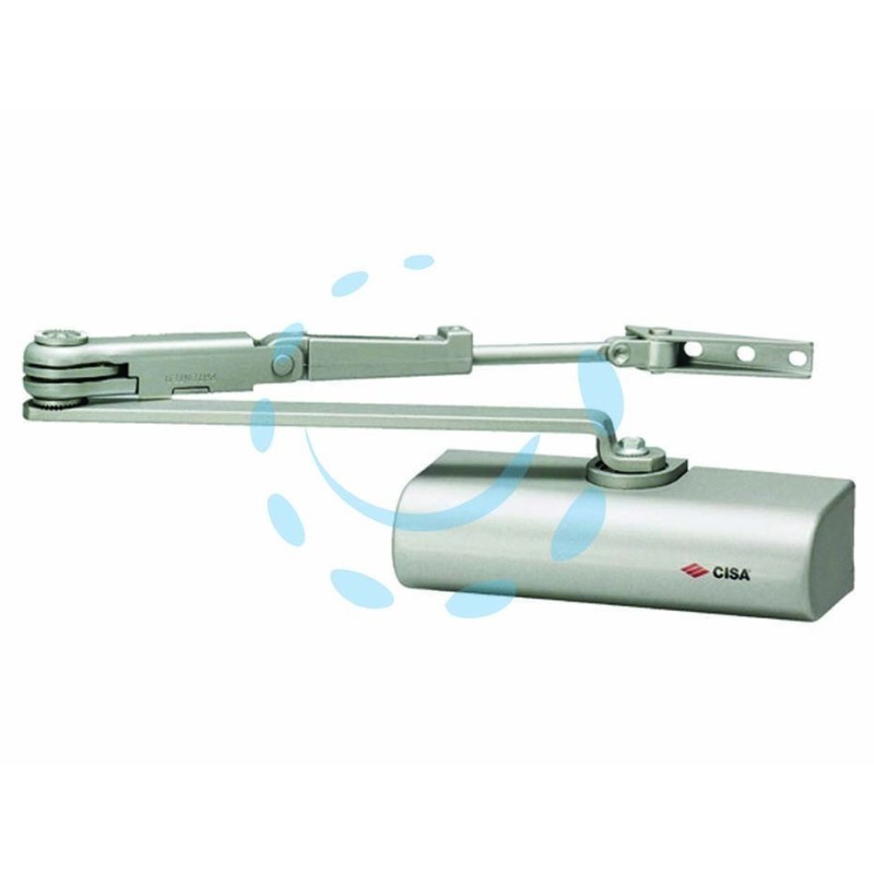 corpo monoblocco in lega d’alluminio, braccio in acciaio con arresto, carter in nylon, valvola di regolazione della velocità di chiusura, forza di chiusura regolabile n° 2-3-4, per porte da cm.85÷110 max con peso da Kg.45÷80 max