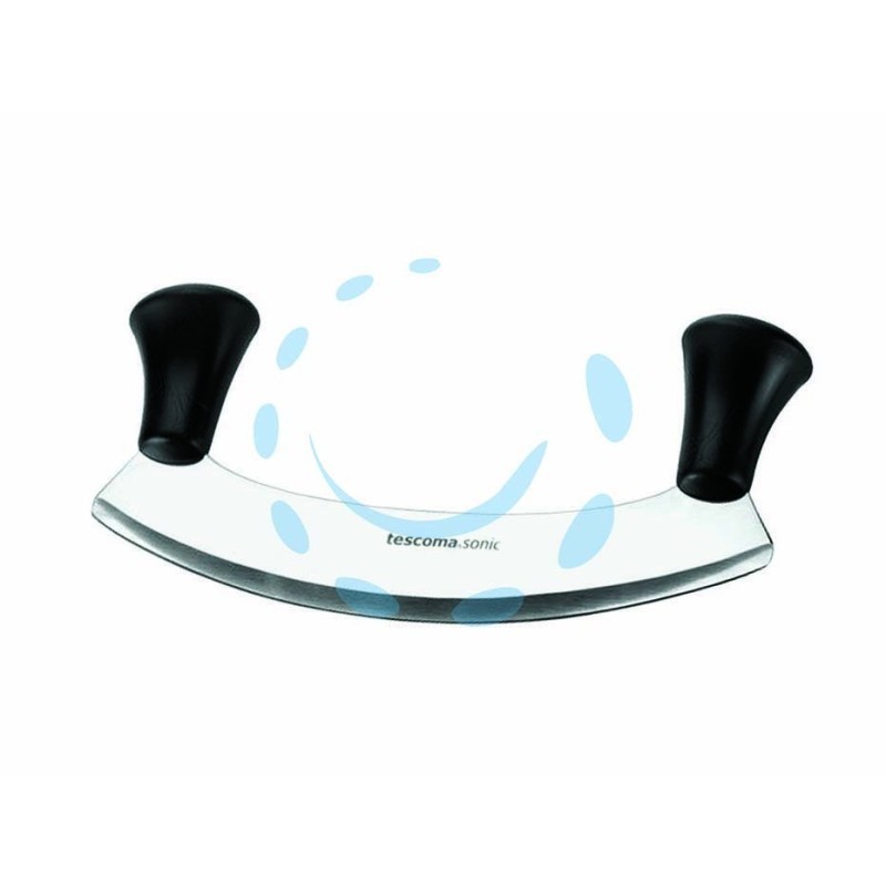 lama acciaio inox ottima qualità - manici ergonomici in plastica resistente - si usa principalmente per tritare le erbe aromatiche - la lama ricurva oscilla avanti e indietro sull'alimento da tritare - tramite i due manici si puòfare pressione verso il basso, mentre la lama a mezza luna aumenta la superficie di taglio