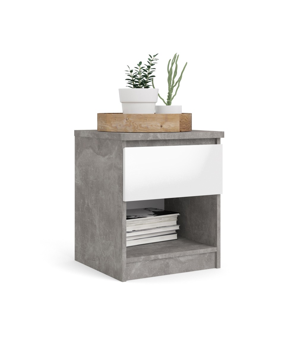 ha un cassetto e un piccolo vano contenitore nella parte inferiore, struttura in legno truciolare di colore cemento con cassetto di colore bianco. Facile da montare e da pulire. Dimensioni 40 x 50 x h 40 cm.
