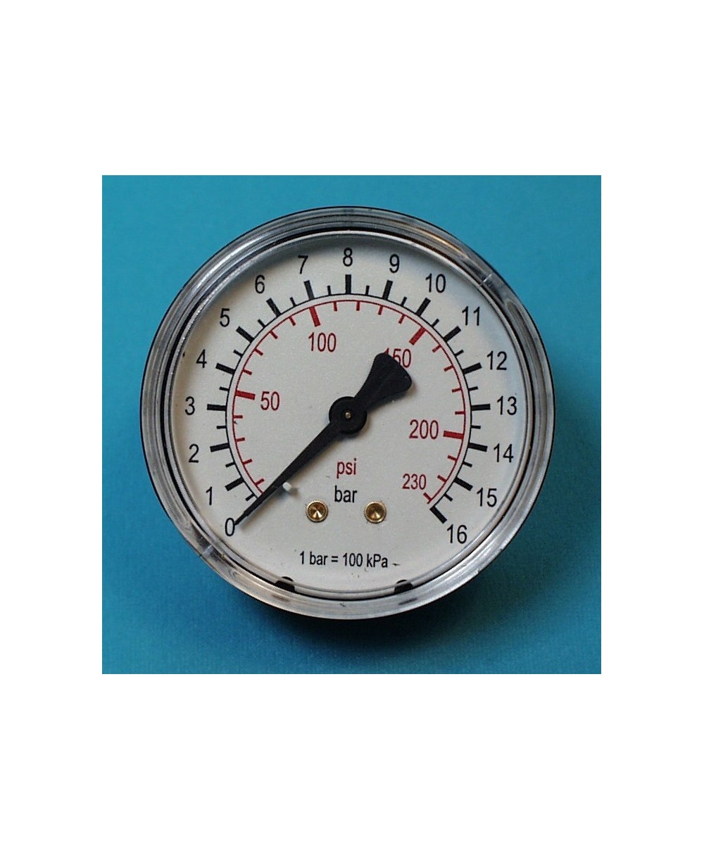 Manometro. Diametro 60 mm. Scala 0- 16 bar. Classe di precisone 2,5. Cassa in plastica con quadrante bianco.