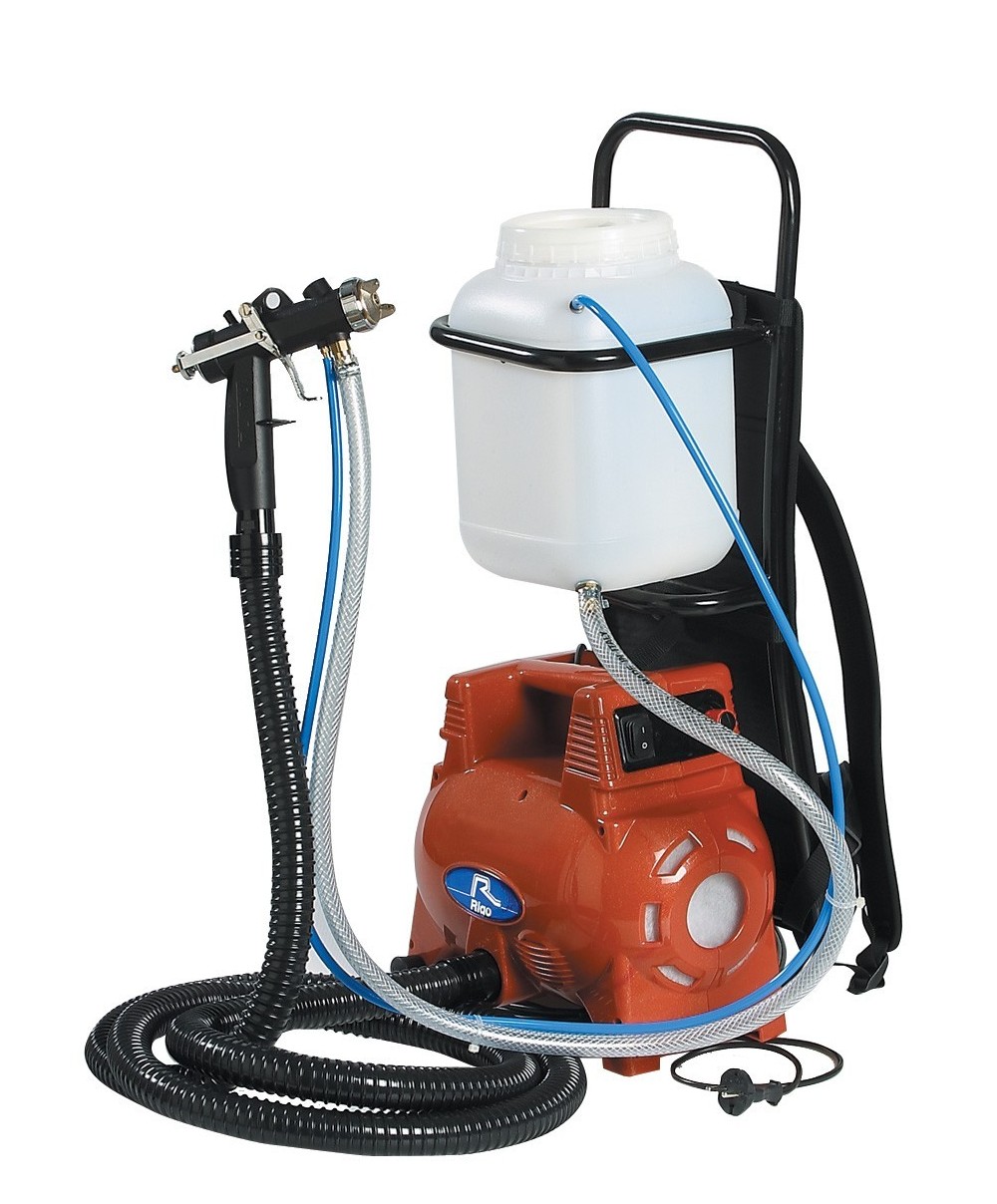 Mod. PMR80/6 turbina a zaino per verniciatura a spruzzo con telaio veriniciato nero. Permette di lavorare a mani libere e di spostarsi agevolmente negli ambienti di lavoro per realizzare lapplicazione a spruzzo di diverse coperture come vernici a base acqua. Regolatore di flusso, filtro facilmente estraibile. Struttura antiurto e antisolvente. Potenza 800 W. Pressione 0,020,18 bar. Volume aria 4502.100 l/min. Serbatoio in polipropilene resistente ai solventi ad aspirazione e gravit con chiusura a vite, da 6 l. Completo di tubo aria per vernici a base acqua e idropitture . Aerografo Maf consente di limitare leffetto nebbia, realizzato in alluminio ugello 3 mm da 600 g, collegato direttamente al serbatoio. Materilai spruzzabili Vernici a base acqua o solvente*, pitture murali. Tubo in PU trasparente da 3 m.