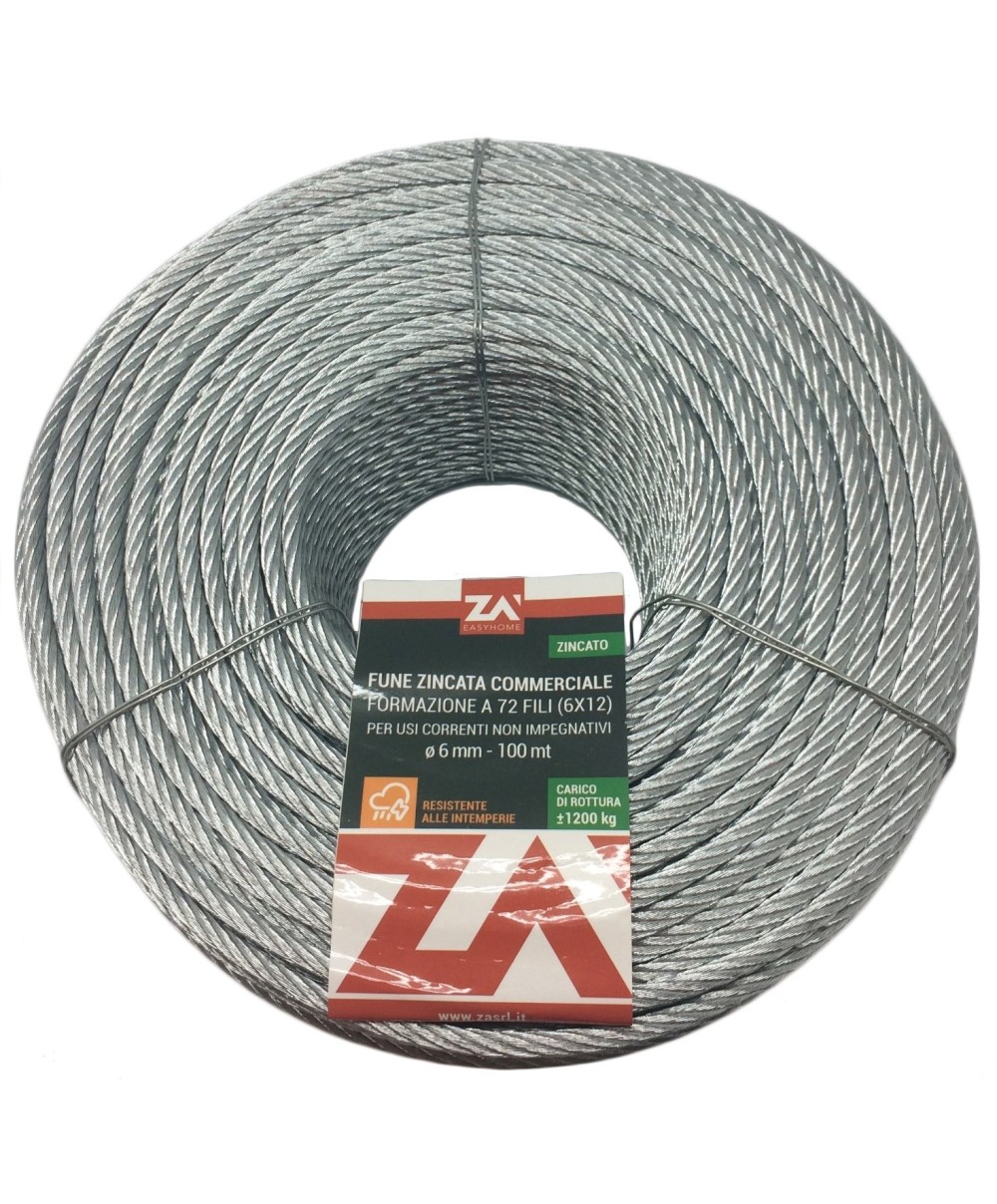 in filo di acciaio zincato, anima tessile. Rotolo da 100 m. Diametro 2 mm. Numero fili 42. Carico di rottura 250 kg. NON adatta al sollevamento.