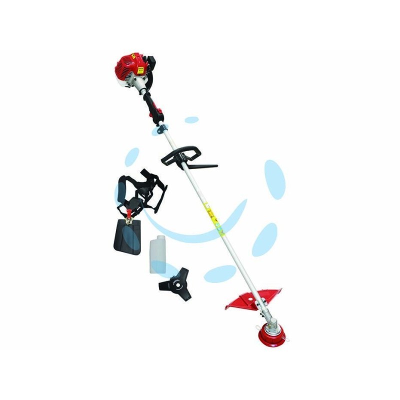 - cc.25,4 - kW 0,70 di potenza - motore 2 tempi a miscela (benzina+olio) - PRIMER per un facile avviamento - accensione elettronica - avviamento a strappo easy start (avviamento senza contraccolpi) - capacità serbatoio di lt.0,65 - trasmissione rigida con sistema antivibrante - tubo ø mm.26 - impugnatura anteriore regolabile a delta - dotazione: testina attacco F 10x1,25 sinistrorso a doppio filo ø mm.2,4 con avanzamento automatico batti e vai + 1disco a 3 denti ø mm.255 + cinghia a sgancio rapido - peso Kg.5,6
