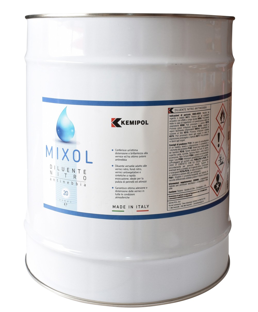 antinebbia a formulazione bilanciata. Idoneo per la diluizione di fondi e finiture licide e opache alla nitro e nitrosintetiche. Grazie al suo forte potere solvente pu essere utilizzato per il lavaggio di tutti gli attrezzi da lavoro. Migliora le caratteristiche di bagnabilit contribuendo allottenimento di una perfetta morbidezza, brillantezza e resa della vernice. Prodotto conforme alla Direttiva. Incolore. Fusto da 20 l