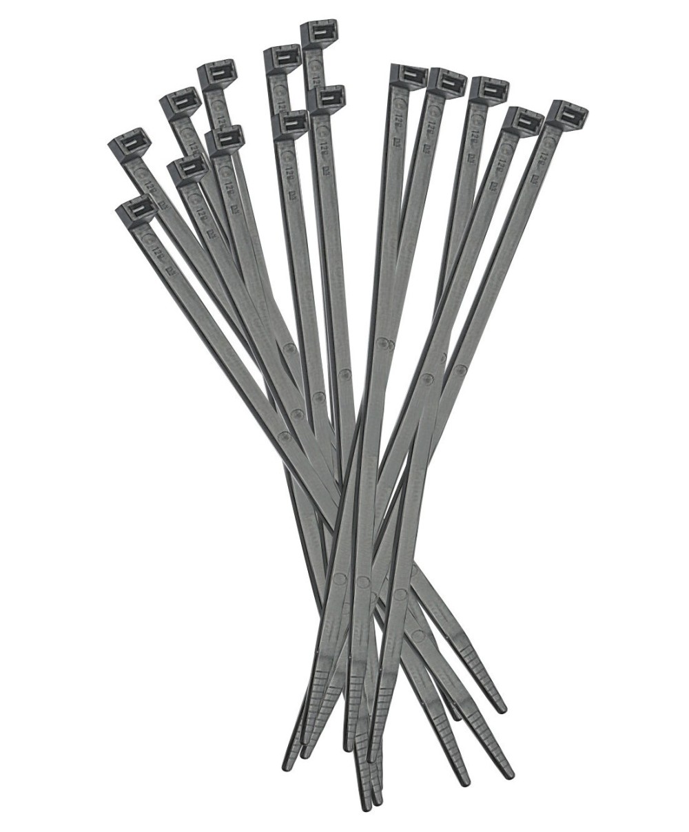 in poliammide 6.6 Bordi laterali arrotondati. Codino inclinato e arrotondato per facilitare linserimento nella testina. Resistente ai raggi UV. Per Impianti elettrici, Cablaggi industriali, Cablaggi automobilistici, Quadristica. Lunghezza 360 mm. Larghezza 4,5 mm. Diametro max serraggio 103 mm. Confezione da 100 pezzi. Colore nero.