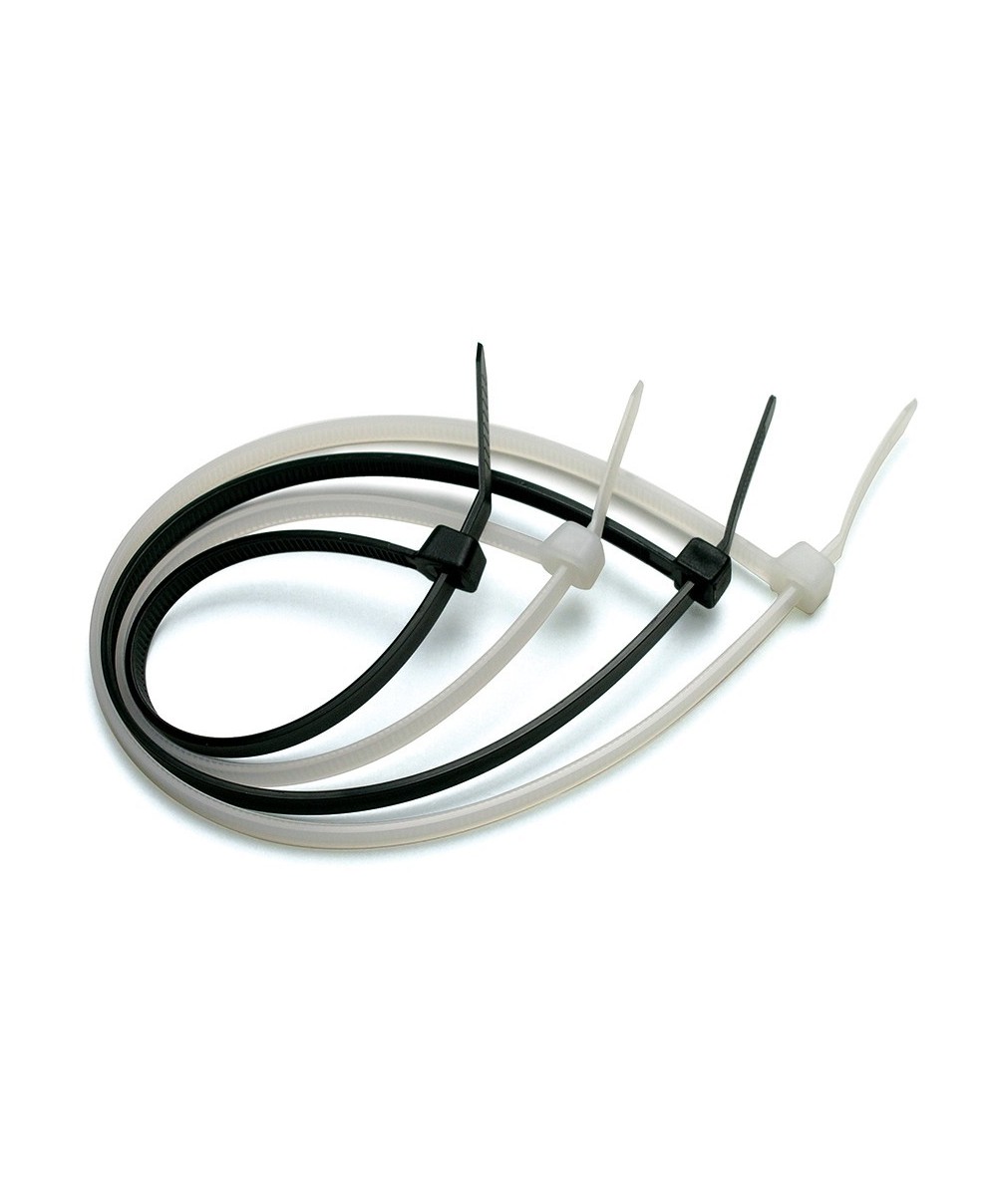 in nylon 6.6. Bordi laterali arrotondati. Lunghezza 150 mm. Larghezza 4,5 mm. Diametro max serraggio 36 mm. Confezione da 100 pezzi. Colore nero.
