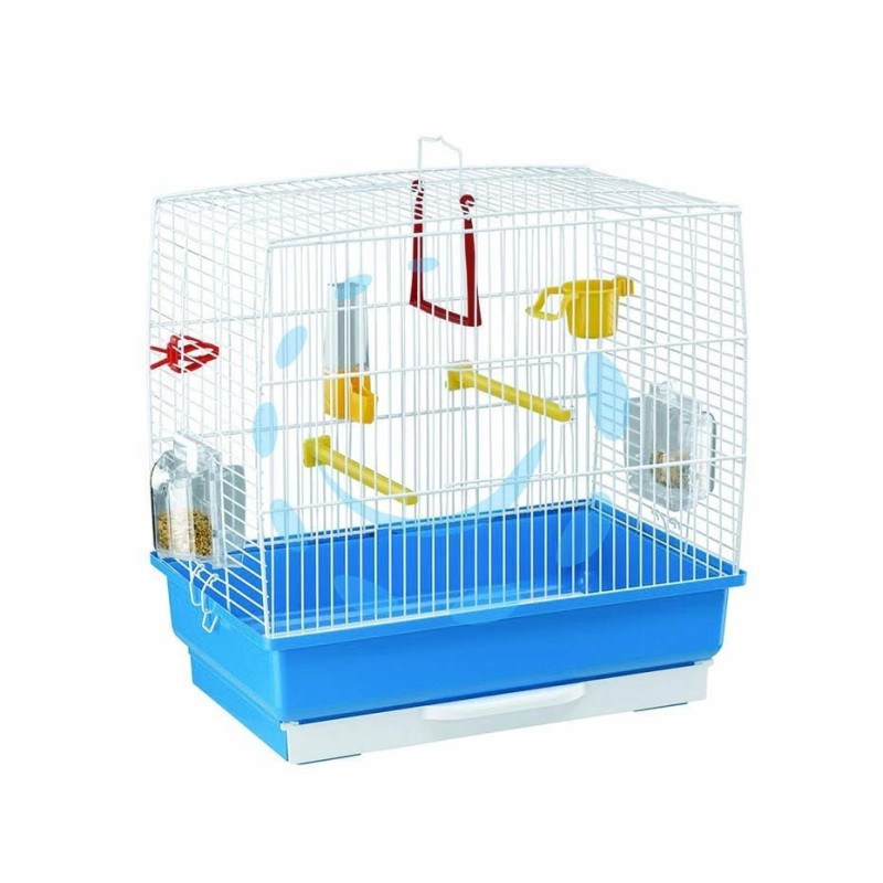 gabbia per canarini e altri piccoli uccelli - fondo in plastica rigida - rete in metallo verniciato resistente alla corrosione - porta d'accesso alla gabbia - vassoio raccogli sporco estraibile dal fondo per facilitare la pulizia - accessori inclusi: 2 mangiatoie girevoli Brava 1, 1 beverino esterno, 1 pinzetta per verdura, 1 mangiatoia per pastoncino, 2 posatoi e 1 altalena