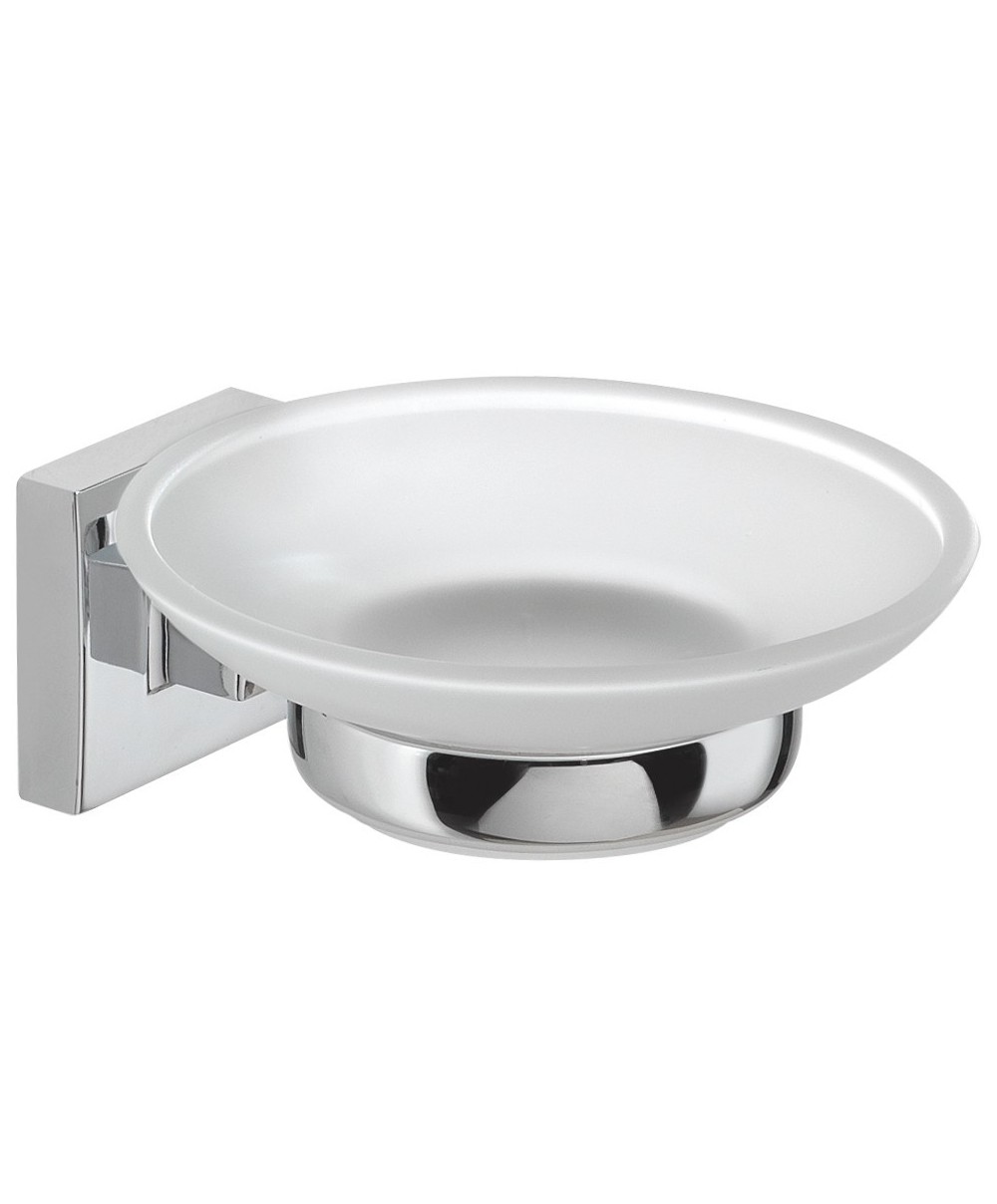 in acciaio inox e cromall, contenitori in vetro satinato. Art. OL11 portasapone. Dimensioni 11 x 12,3 x 4,8 cm.