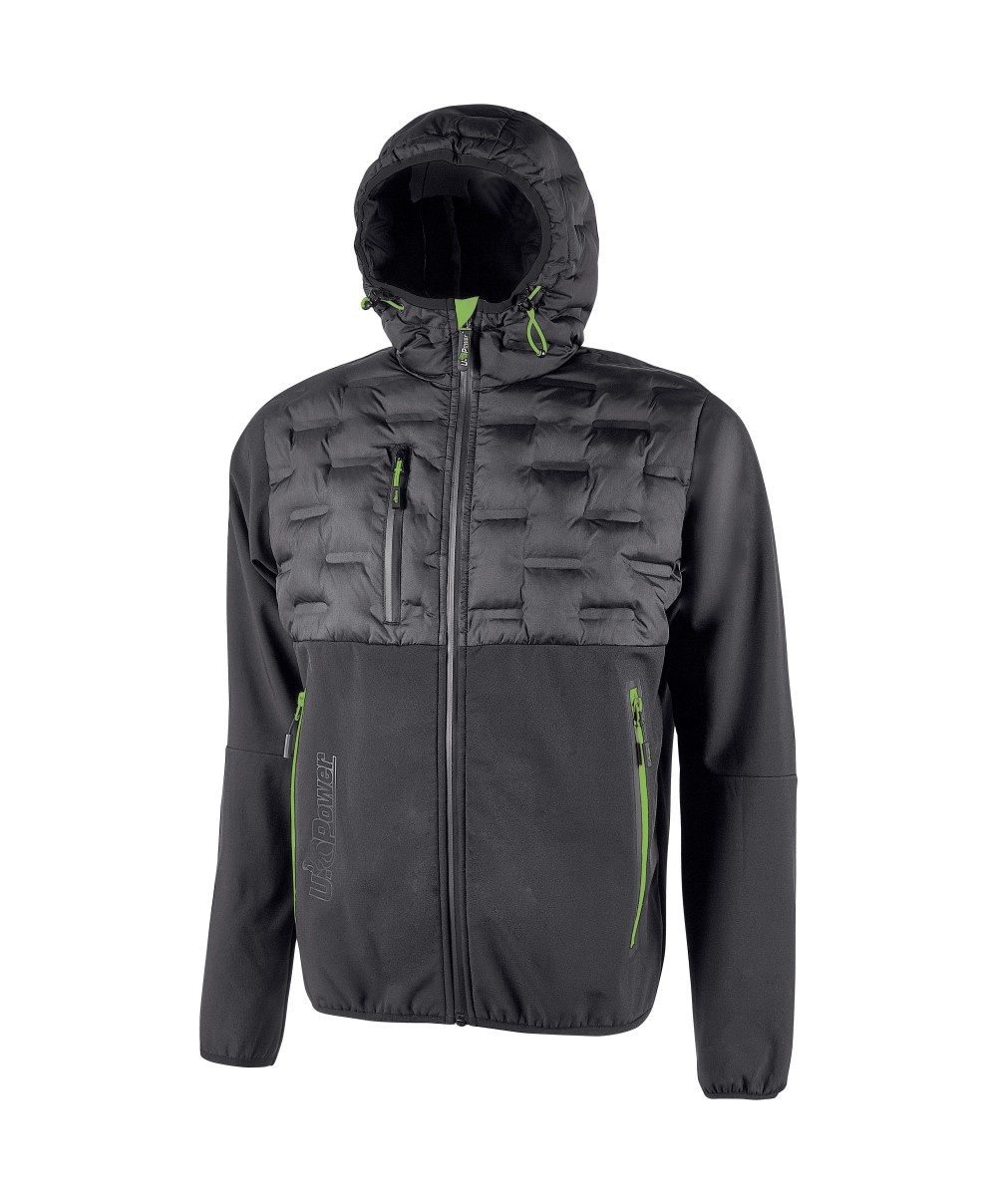 Giacca ibrida idrorepellente traspirante e antivento estremamente versatile e ideale per chi svolge lavori dinamici in ambienti freddi o medio temperati. Unisex. Realizzata con 96 Poliestere, 4 Spandex. Peso 320 gr/mq. Chiusura centrale con zip impermeabile. Cappuccio fisso e regolabile, polsini elasticizzati. Fodera interna in nylon e micropile con stampa serigrafica. Dotato di due ampie tasche frontali chiuse con zip fluo e una tasca sul petto chiusa con zip impermeabile. Fondo sagomato e piping fluo su schiena. Logo U-Power tono su tono.