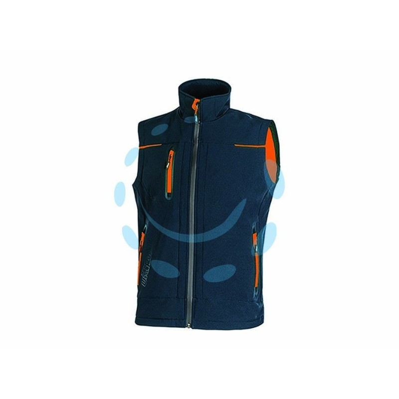 gilet in tessuto Soft Shell impermeabile, traspirante e antivento - comodo e resistente con fodera interna in morbido micro-fleece fluo - dotato di tasca porta cellulare sul petto con tecnologia Free Sound con chiusura zip fluo, due tasche frontali chiuse con zip fluo e coulisse antimpigliamento regolabile all'interno, due ampie tasche interne - chiusura centrale con zip impermeabile - inserti in reflex per garantire la massima visibilità - fondo sagomato - nastro reflex su colletto nella parte posteriore - tessuto 96% poliestere, 4% spandex - membrana U-TEX - 310 gr/mq