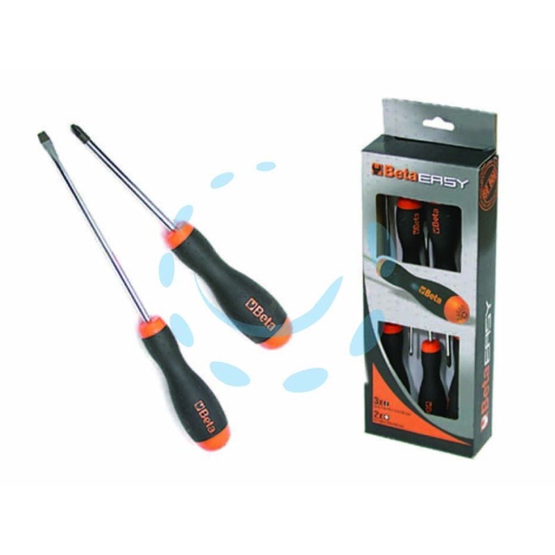 lama in acciaio temperato cromato con punta nera, impugnatura bimateriale in polipropilene, duro e resistente di colore arancio con rivestimento in gomma nera contenuto: pz.3 art.1201 a taglio 3x75 - 4x125 - 5,5x150 - pz.2 art.1209PZ a croce PZ 1x80 - PZ 2x100