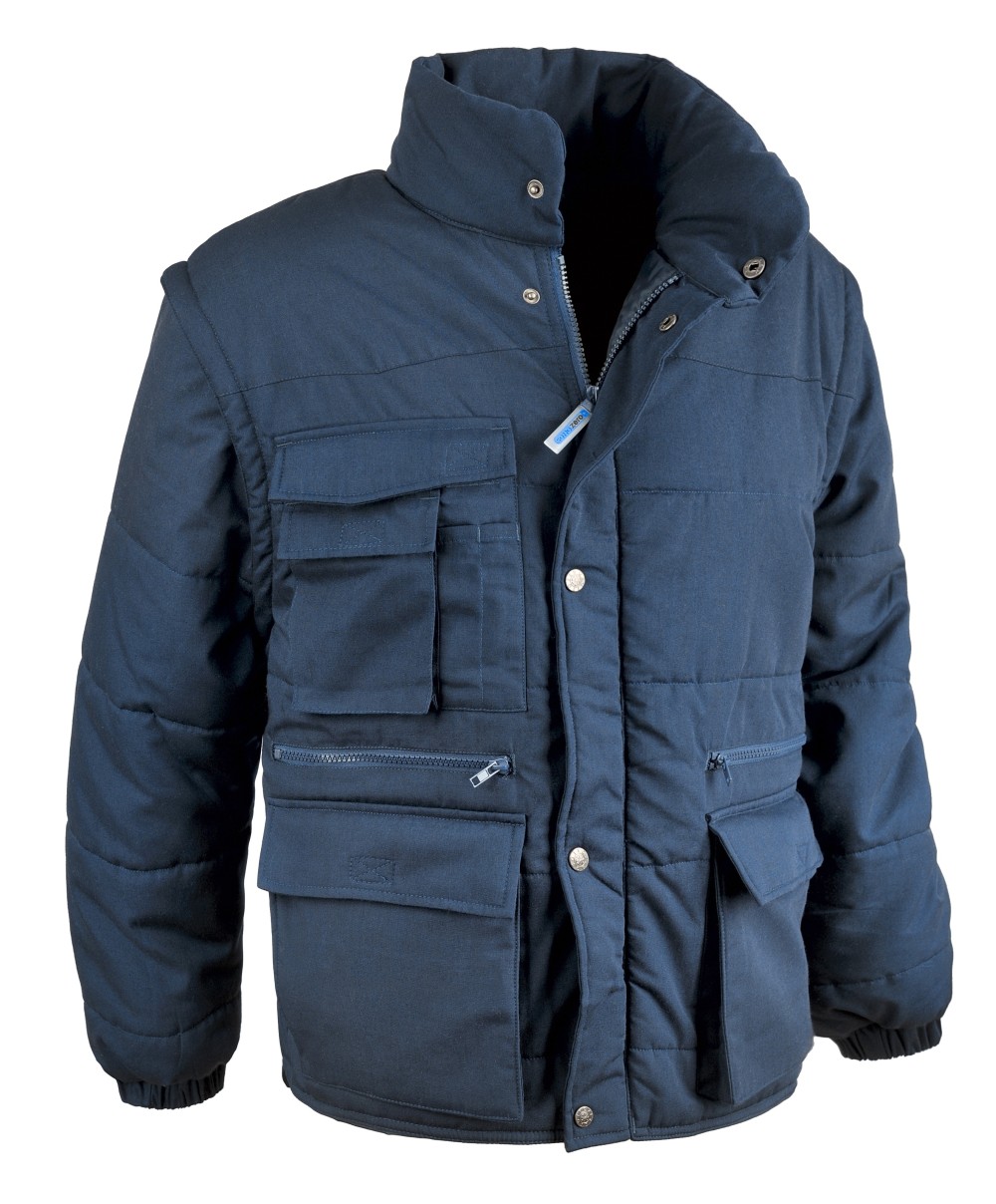 Mod. SUPER ANTARES 80% poliestere, 20% cotone. Trapuntato con maniche staccabili, imbottitura in poliestere 200 g/mq. Chiusura con cerniera e bottoni. Esterno multitasche. Tasca interna. Polsini elasticizzati. CE Ia categoria. Colore blu. Taglia XL