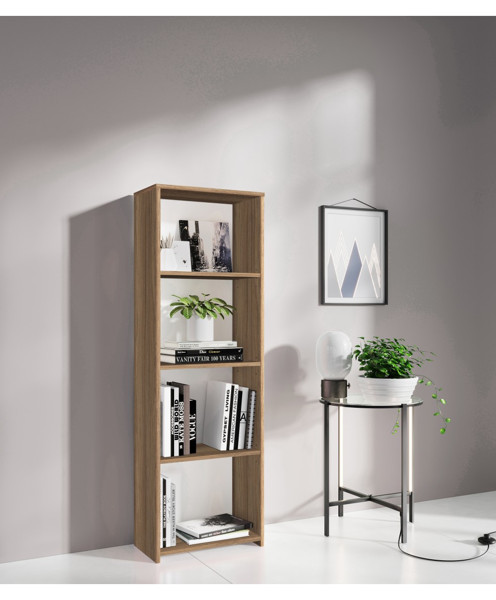 E' una libreria-scaffale slim a quattro vani dal design moderno da parete. Struttura realizzata in truciolare facile da montare. Dimensioni 45 x 25 x h 138 cm. Colore rovere barly.