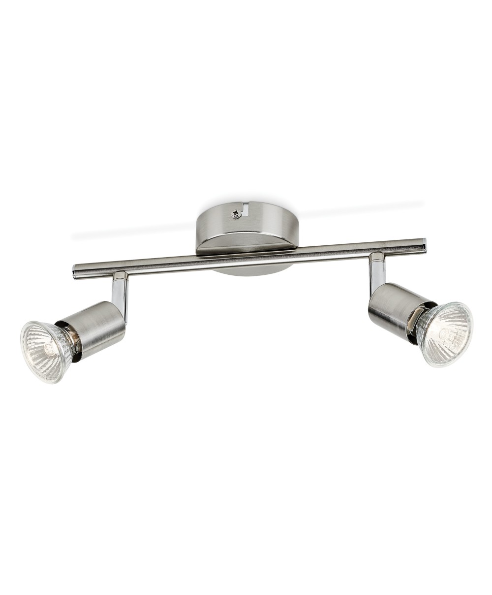 per soffitto, parete in metallo finitura nichel. Consente di dirigere la luce dove si desidera, semplicemente regolando, ruotando o inclinando la parte superiore dello spot. Attacco GU10. Tensione 220/240V - 50/60 Hz - IP20. Forniti senza lampada (max 50W). Posti 2. Dimensioni 80x324xh130 mm. Peso 0,280 kg.