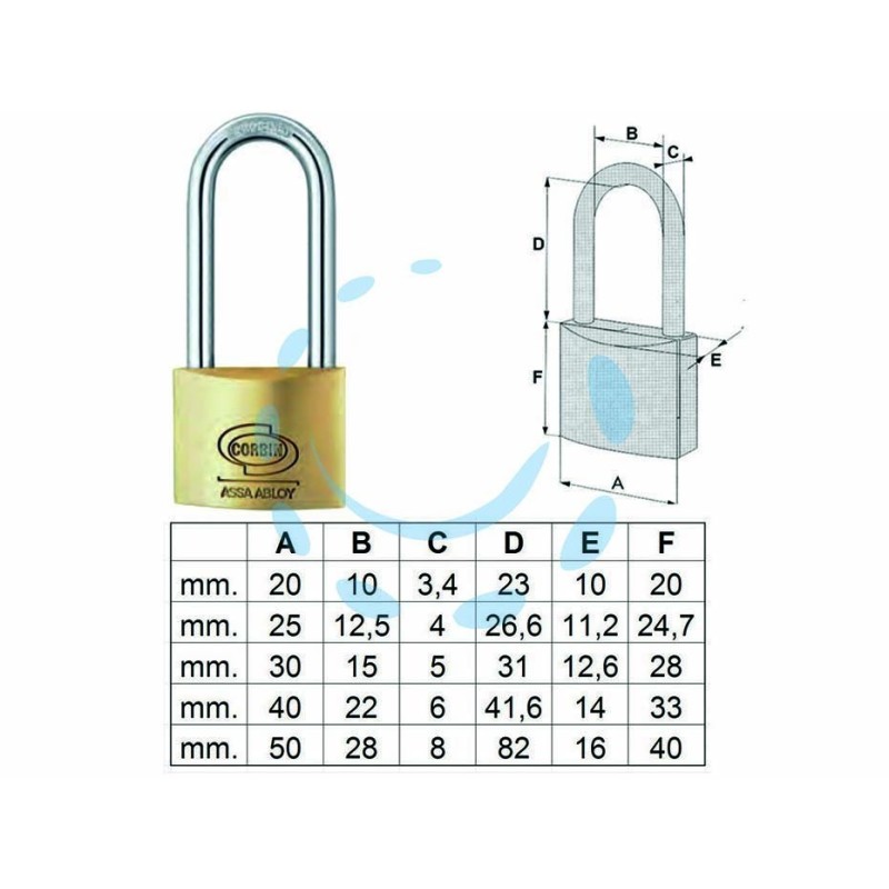 corpo monoblocco in ottone satinato, arco in acciaio carbonitrurato, doppio scrocco da lucchetti > mm.30, spina antigrimaldello per lucchetti > mm.30, dotazione 2 chiavi