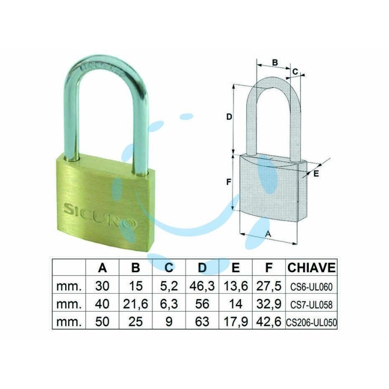 corpo in ottone lucido, arco in acciaio temperato cromato, dotazione 3 chiavi