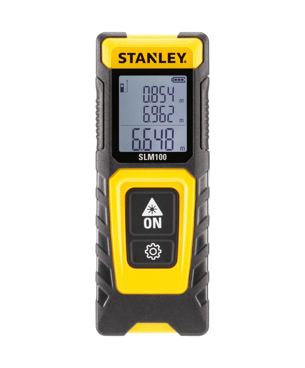 Art. SLM100 Alimentazione a batterie 2 AAA. Portata da 20 cm a 30 m. Precisione 3 mm a 10 m. Funzioni distanza,area, volume, calcolatrice Pitagora , misura minima/massima. Schermo LCD nero con scritte in bianco, a tre linee, di grandi dimensioni, permette migliore visibilita anche in condizioni di forte illuminazione. Memoria ultime tre misurazioni. Autospegnimento dopo 120 secondi. Due punti di misurazione base e fronte. Facilita duso operativita a due bottoni, il bottone ON consente di rilevare le misurazioni, il secondo bottone permette di cambiare le funzioni. Rivestimento in gomma, indice di protezione IP40.