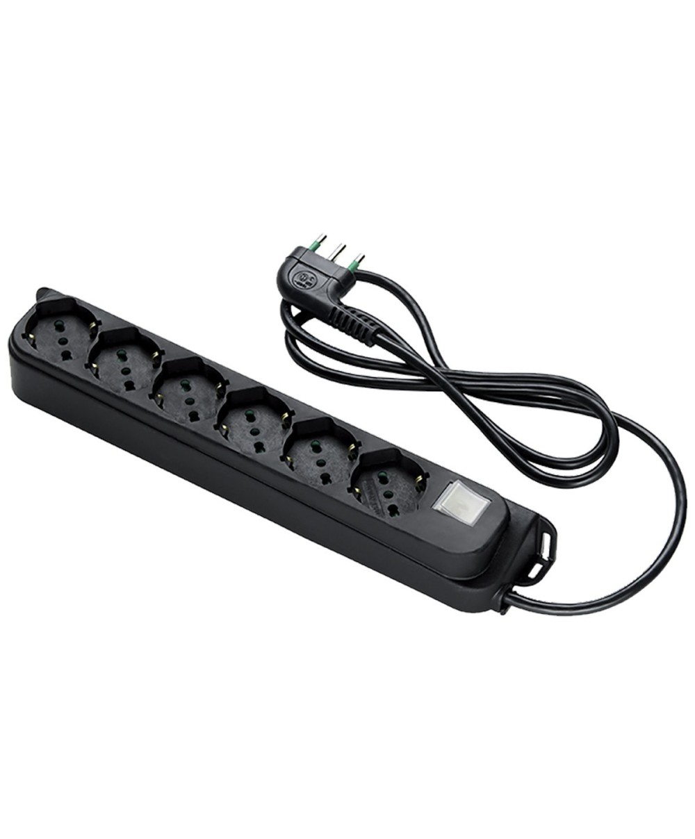 Art. 47.431 a norme di sicurezza CEI. Spina a squadra 16A 2P+T. 6 prese schuko/bipasso 10/16A 2P+T - P40. Interruttore luminoso. Tensione 250V - 50/60 Hz - IP20. Potenza max 3.500W. Sezione cavo 3x1 mm H05VV-F. Lunghezza cavo 1,5 m. Peso 367,2 g. Colore nero