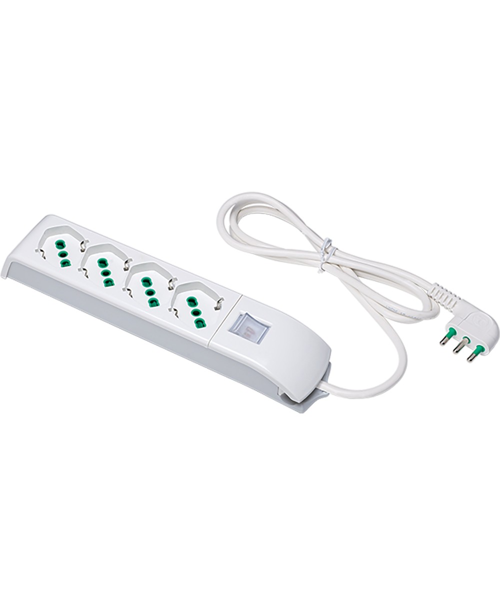 Art. 410100 mod. Fido realizzata in policarbonato a 4 prese bipasso schuko 10/16A 2P+T - 230V - 50 Hz. Lunghezza cavo 1,5 m. Cavo a doppio isolamento sezione 3x1 mm HO5 VV-F. Spina a squadra 16A 2P+T + interruttore luminoso. Possibilit di fissaggio al muro. Cavo orientabile e sostituibile. A norme di sicurezza CEI. Colore bianco.