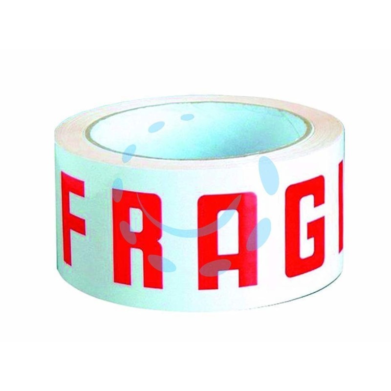 film in polipropilene - base bianca con scritta rossa - adesivo acrilico a base acqua - resistente all'umidità dopo applicazione - elevata resistenza meccanica - alta grammatura - resistente alle variazioni di temperatura - adatto per imballaggi di medio peso - bassa rumorositÃ