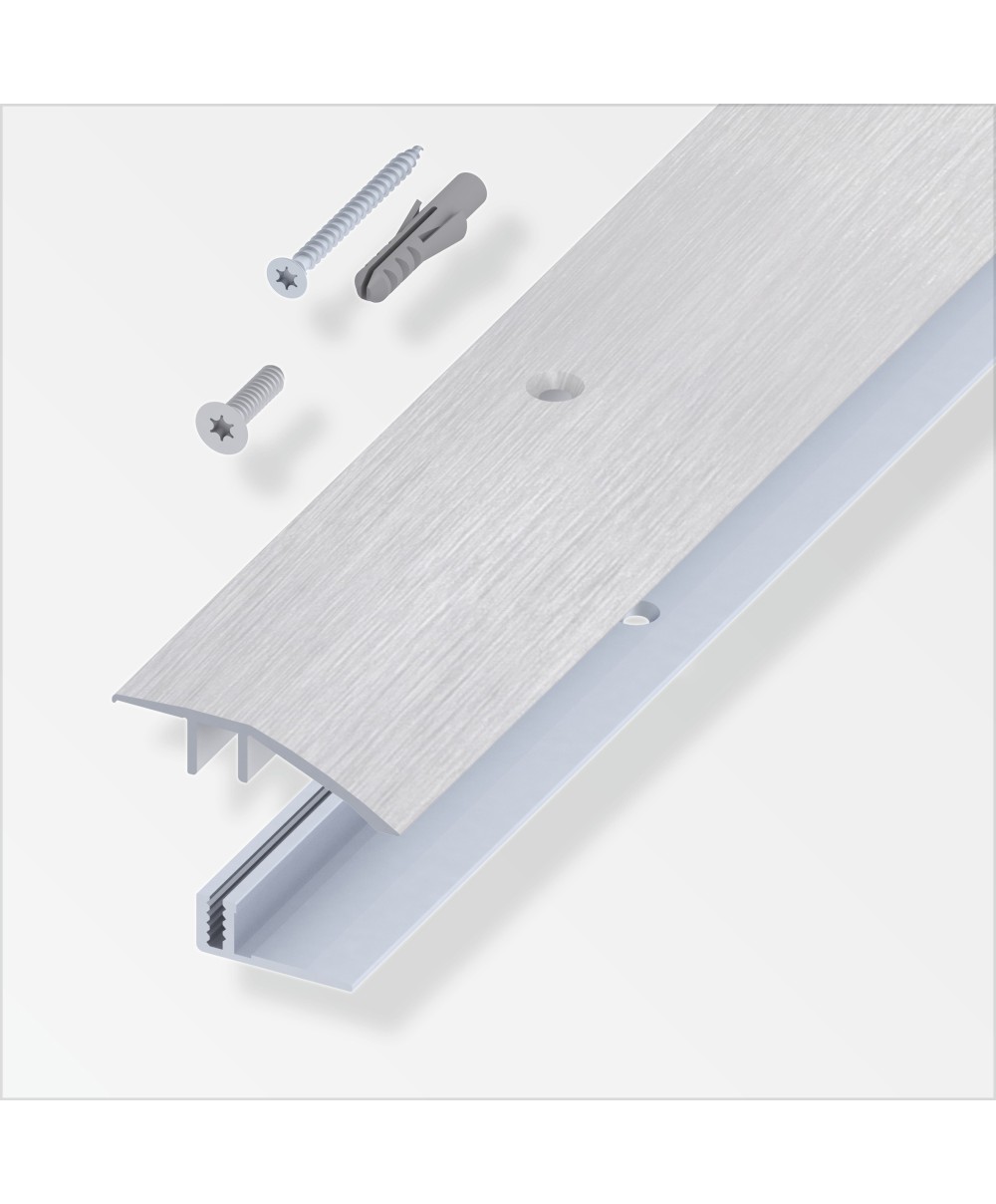 profilo di compensazione livello in alluminio anodizzato verniciato a polveri. Completo di accessori per il fissaggio. Terminale a scivolo per parquet da 7 a 15 mm di spessore. Larghezza 45 mm. Aste da 100 cm. Colore grigio spazzolato.