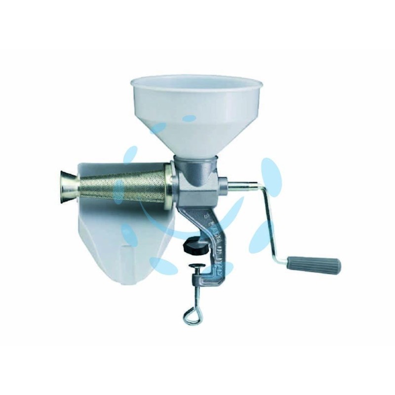 corpo in ghisa trattata a caldo per uso alimentare con polveri epossidiche, elica in materiale plastico per alimenti adatto all'utilizzo con prodotto caldo - cono filtro in lamiera stagnata - imbuto e sgocciolatoio in materiale plastico per alimenti - adatto anche per la produzione di marmellate e succhi di frutta - pratico sistema di fissaggio con morsetto a vite con galletto per bloccaggio sul piano di lavoro - peso Kg.2,2 - dimensioni imballo cm.30x22x32h. (art.8602N)