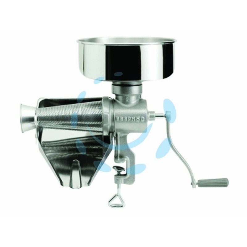corpo in ghisa trattata a caldo per uso alimentare con polveri epossidiche, elica in resina acetalica per alimenti - cono filtro in lamiera stagnata - imbuto e sgocciolatoio in acciaio inox - adatto anche per la produzione di marmellate e succhi di frutta - pratico sistema di fissaggio con morsetto a vite con galletto per bloccaggio sul piano di lavoro - peso Kg.5,8 - dimensioni imballo cm.45x32x45h. (art.8502N)