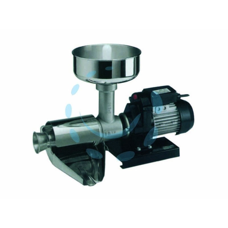 - 500w di potenza - tensione 230v / 50Hz - motore asincrono ad induzione 0,40 Hp classe di protezione IPX5 - ventola di raffreddamento, calotta copriventola e scatola interruttore/condensatore a tenuta stagna costruite in materiale plastico - corpo macchina in ghisa trattata per uso alimentare con polveri epossidiche cotte in forno a 300°C - elica in resina acetalica idonea al contatto con alimenti ed antifrizione - perno trasportatore in nylon 6,6 - cono, filtro, sgocciolatoio, paraspruzzi e imbuto di grande capacità sono interamennte costruiti in acciaio INOX AISI 304 - riduttore assiale ad ingranaggi a bagno d'olio "lunga durata" ed idoneo al contatto con gli alimenti - adatto anche per la produzione di marmellate - pestello in polietilene - produzione 150/340 Kg/h. circa - peso Kg.17 - dimensioni imballo cm.68x35x42h. (art.9004N) (possibilità di trasformazione in tritacarne opzionale n°12 o n°22)