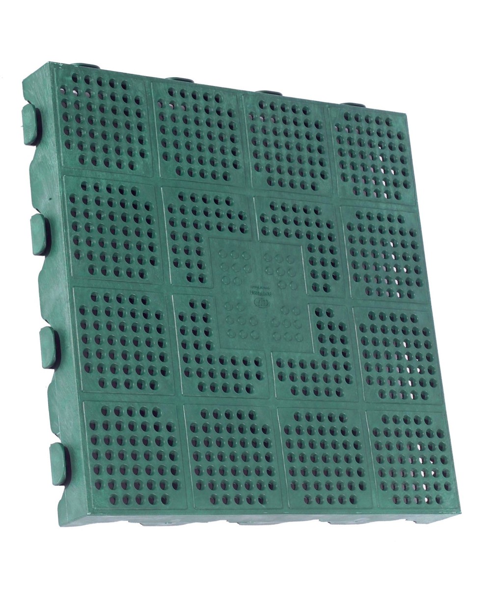 in polipropilene.Colore verde Per uso esterno ed interno, resistente agli agenti atmosferici,solventi ed oli. Ideale per pavimentazioni da giardino, bordipiscina, campeggi.Piastrella munita di incastri laterali per la giunzione.portata statica 9000 kg/mq distribuiti uniformemente. Piastrella cm 39x39x4,5(compreso incastro cm 40x40)