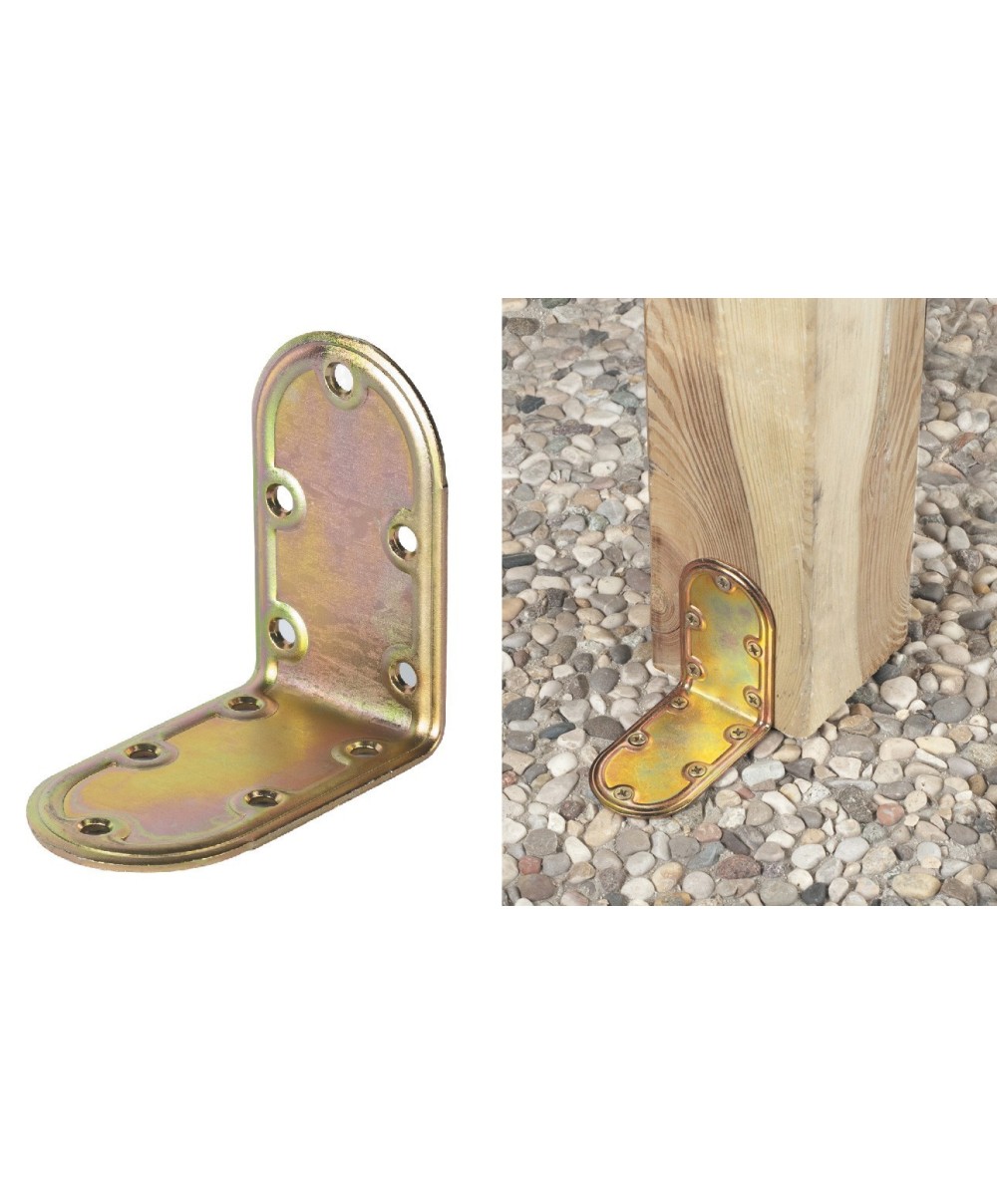 Art. 971 giunzione piegata arrotondata, modello pesante. Realizzata in acciaio tropicalizzato per pannelli e grigliati in legno. Dimensioni 100 x 100 mm. Spessore 2,2 mm. Peso 164 g.