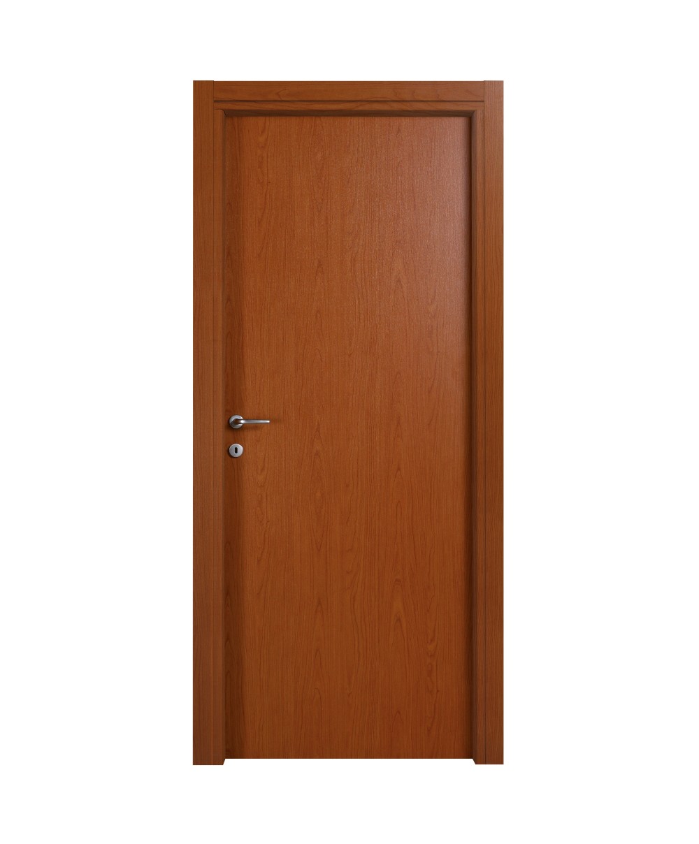 Anta tamburata di spessore nominale 44 mm, riempimento in cartoncino trattato, placcato con pannelli in MDF spessore 3/4 mm nobilitato con carta finish. Telaio piatto in MDF di spessore 40 mm con guarnizione di battuta di gomma. Coprifilo telescopici esterno ed interno in Mdf da 60 mm con aletta utile da 8 mm. Ferramenta serratura mediana. Anuba reversibili. Dimensioni 210x90 cm. Colore ciliegio