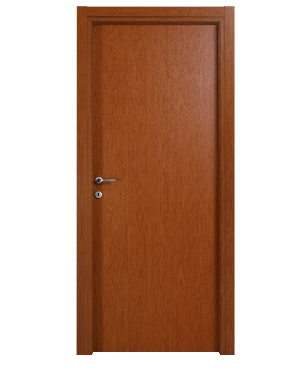 Anta tamburata di spessore nominale 44 mm, riempimento in cartoncino trattato, placcato con pannelli in MDF spessore 3/4 mm nobilitato con carta finish. Telaio piatto in MDF di spessore 40 mm con guarnizione di battuta di gomma. Coprifilo telescopici esterno ed interno in Mdf da 60 mm con aletta utile da 8 mm. Ferramenta serratura mediana. Anuba reversibili. Dimensioni 210x80 cm. Colore ciliegio