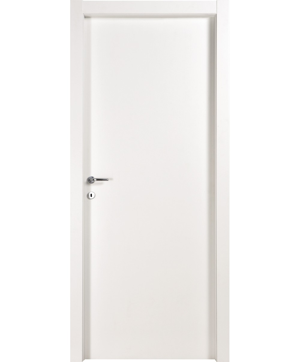 Anta tamburata di spessore nominale 44 mm, riempimento in cartoncino trattato, placcato con pannelli in MDF spessore 3/4 mm nobilitato con carta finish. Telaio piatto in MDF di spessore 40 mm con guarnizione di battuta di gomma. Coprifilo telescopici esterno ed interno in Mdf da 60 mm con aletta utile da 8 mm. Ferramenta serratura mediana. Anuba reversibili. Dimensioni 210x80 cm. Colore bianco